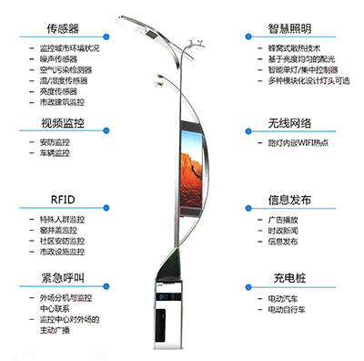 新颖性;路灯采用智能控制LED提供优质照明,同时具有多功能。可实现环境意识、治安监控、wifi便利、多媒体视频播放、方便充电、紧急呼叫救援等功能。智慧路灯,智慧路灯杆,定购热线:13676294460